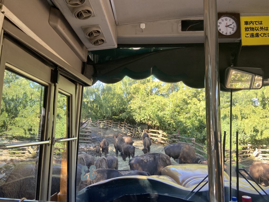 バスに乗って園内をまわるんですが、最初に驚いたのは動物との距離!