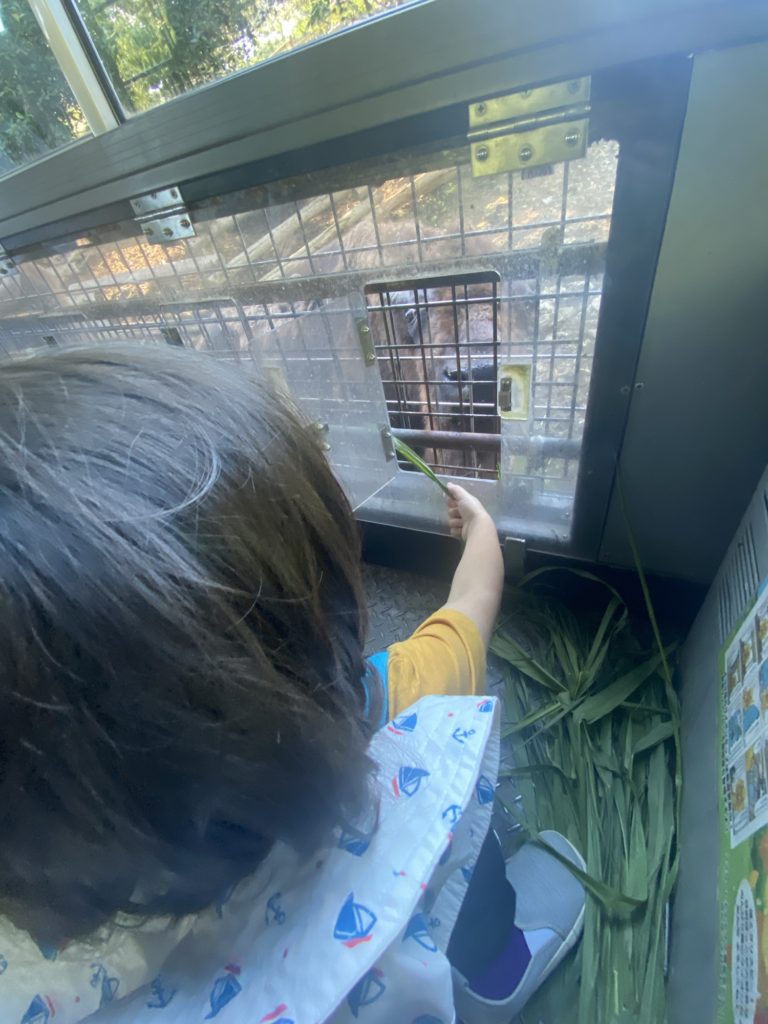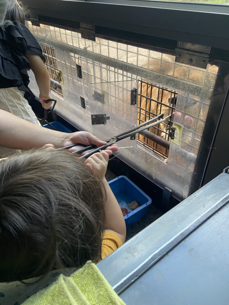 ライオン🦁への餌やりはゆうとにはトングが重いのでサポート♪